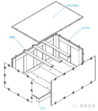 前程包装技术人员到客户现场测量电机尺寸,了解电机结构,分析其重心位置,采用为钢边箱(如图三所示)为外箱包装,可堆码2层。
